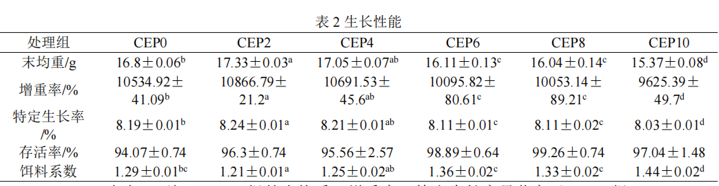 由表2可知,CEP2组的末均重、增重率、特定生长率显著高于CEP0组,CEP2组的饵料系数显著低于CEP0组(P<0.05),随着棉籽酶解蛋白替代鱼粉量增加,末均重、增重率和特定生长率显著下降,饵料系数显著增加。饲料中添加2%的棉籽酶解蛋白可以促进凡纳滨对虾的生长,添加2%~4%的棉籽酶解蛋白对凡纳滨对虾的生长没有显著影响。 4.2形态学