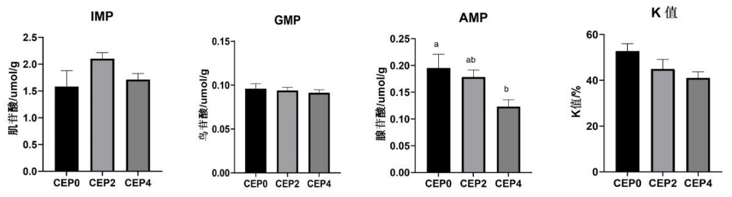 图3 肌肉饱和脂肪酸和不饱和脂肪酸 由图3可知,饲料中添加2%~4%的棉籽酶解蛋白替代鱼粉对凡纳滨对虾的肌肉的饱和脂肪酸和不饱和脂肪酸没有显著影响,但可以提高n-3/n-6不饱和脂肪酸的比例。 4.7.3肌肉核苷酸