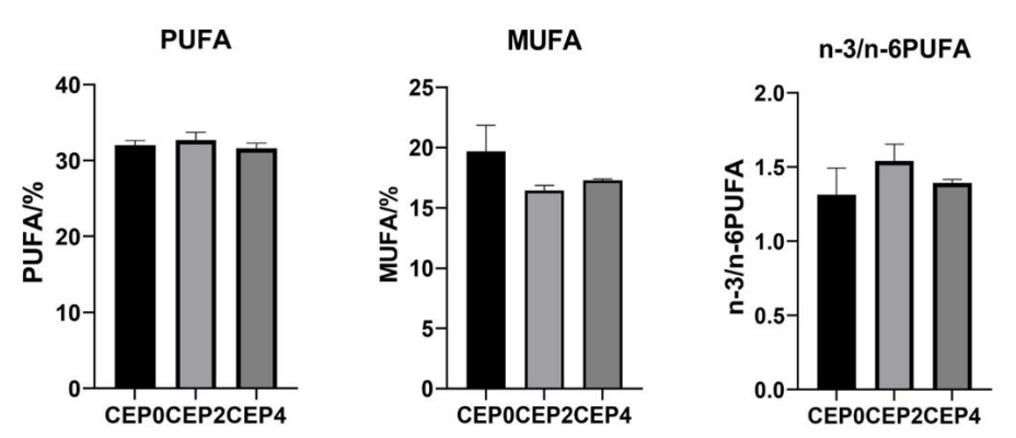 由表10可知,CEP8和CEP10组的天门冬氨酸、谷氨酸、甘氨酸和精氨酸显著高于CEP0组,CEP10组的丙氨酸显著高于CEP0组(P<0.05),得出饲料中添加8%~10%的棉籽酶解蛋白替代鱼粉可以增加凡纳滨对虾的风味氨基酸含量,提高肌肉的风味。 4.7.2肌肉脂肪酸